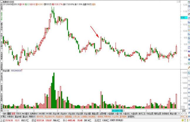 如圖該股在2012年8月9日的股價走勢,是從高位向下下跌的K線走勢,但是在下跌的過程中突然出現(xiàn)了一根向上拉升的大陽線,之后股價再次繼續(xù)下跌,說明主力沒有充分的蓄勢,并不是真正的愿意做多,有巨量換手的嫌疑,投資者要注意下跌中的風(fēng)險,不要盲目的追入,該形態(tài)是明顯的下跌中繼大陽線,是短暫的反彈,反彈結(jié)束依然會繼續(xù)下跌,投資者要注意操作風(fēng)險。