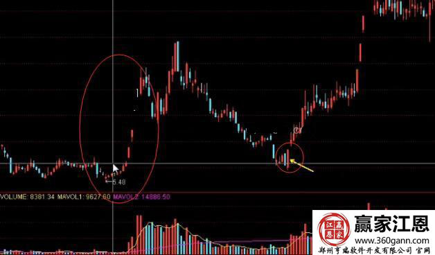 3、當股價回跌到只有一個漲停的時候,就可以進行買進,而且買進持股多是大牛股的形態(tài);
