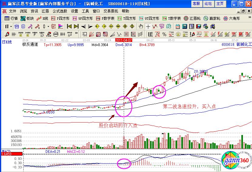 氯堿化工出現(xiàn)連續(xù)拉升的三陽線是一個比較特殊的案例,首先我們來分析前期的個股走勢,如圖在2011年4月2日的時候,股價拉升上漲突破了極反通道藍色上軌線,并且量能放大,macd指標形成了金叉買入的操作信號,是一個不錯的追漲介入點,在介入之后觀察后期走勢,股價連續(xù)拉升突破了紅色外軌線,在高檔區(qū)緩慢拉升三大陽線,但是上漲乏力出現(xiàn)了短暫的回調走勢,股價回踩藍色上軌線。