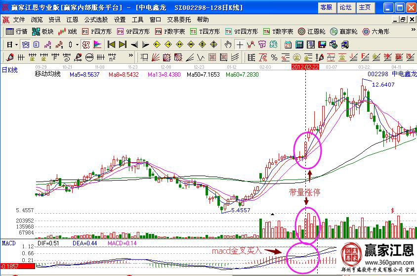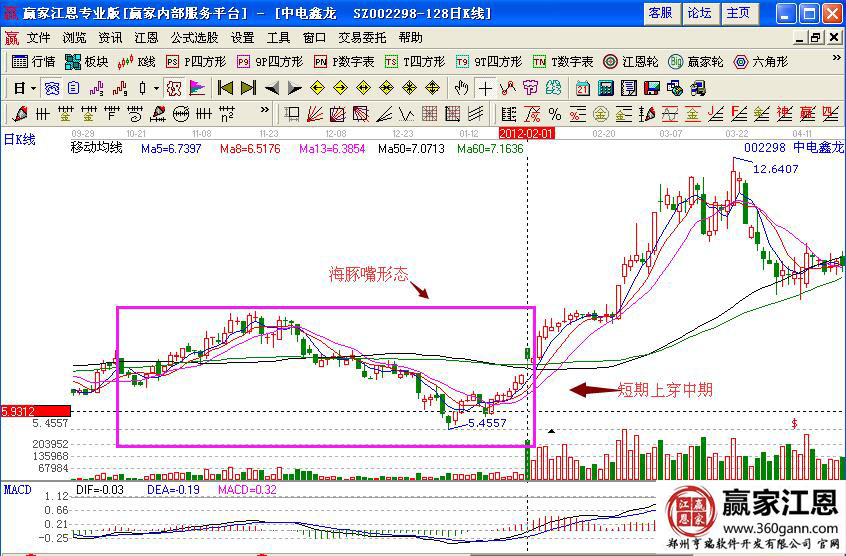 具體的案例走勢(shì)形態(tài)如圖中電鑫龍(002298)在2012年2月1日的個(gè)股走勢(shì)形態(tài),加上前期的個(gè)股走勢(shì)形態(tài),形成的是海豚嘴的形態(tài)走勢(shì),形成的低位量能走勢(shì),同時(shí)在2月1日的時(shí)候,短期均線(xiàn)向上穿過(guò)中期均線(xiàn),并且出現(xiàn)了標(biāo)志性的K線(xiàn)走勢(shì),是一個(gè)典型的牛股形態(tài)走勢(shì),低位洗盤(pán),量柱放量之后是啟動(dòng)點(diǎn)位。