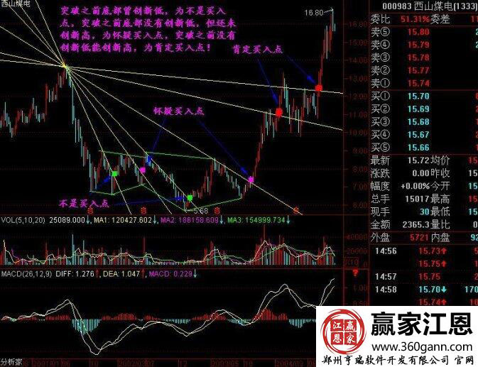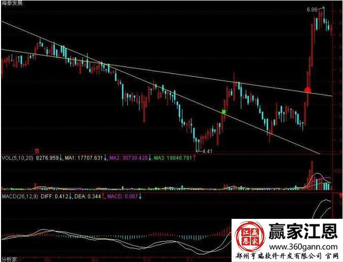 如圖海泰發(fā)展中的紅色點標(biāo)注位置,就是其中的肯定買入點;