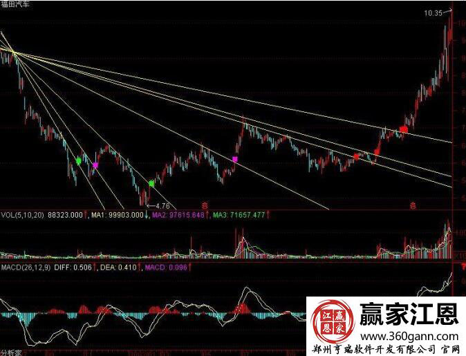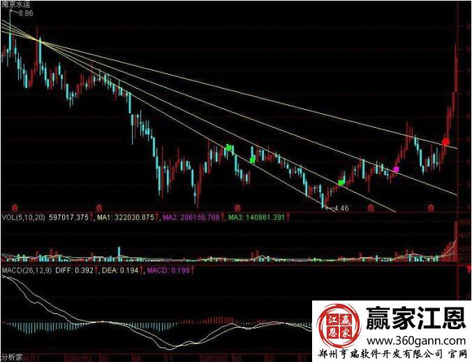 如圖該股的走勢形態(tài)形成了一個階段性的最高點,而且在之后的突破點中,都沒有突破新高,從其畫圖的走勢中,能夠看出,扇骨線具有三個基本特征:伺從性,指的是K線會依據(jù)扇骨的走勢進行運行;支撐向,股價一旦沖過扇骨線以后,再回落的話,一般壓不到前面的扇骨線;突破性,只有突破才有行情,沖不過去就沒有行情;