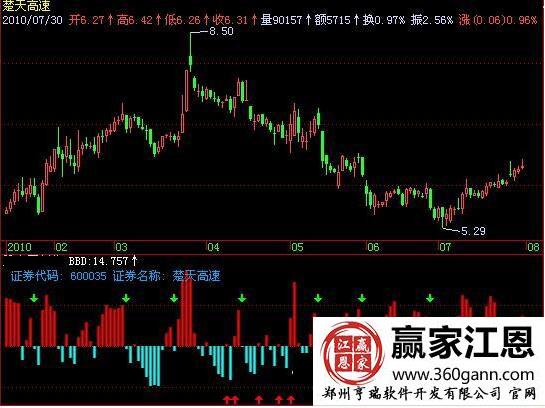 是利用紅綠柱線進(jìn)行表示的,其中股價(jià)上漲中,紅柱線偏多,具體的走勢(shì)案例如圖楚天高速在2010年7月30日的股價(jià)走勢(shì),在8.50元的高點(diǎn)見(jiàn)頂,5.29元見(jiàn)底,投資者可以從中把握操作的機(jī)會(huì)。
