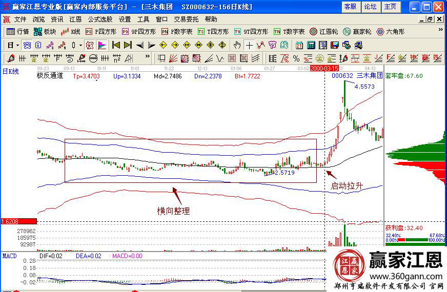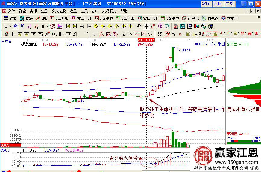 然而三木集團(tuán)逐漸隨著大盤(pán)的回升而上升,從2000年3月15日向上突破整理平臺(tái),開(kāi)始向上拉升,對(duì)應(yīng)的量能放大,macd指標(biāo)形成金叉,關(guān)鍵是股價(jià)處于極反通道生命線上方,籌碼高度集中,是上漲的行情預(yù)測(cè),投資者可以利用成本重心捕捉強(qiáng)勢(shì)股的走勢(shì),當(dāng)后期股價(jià)跌破支撐線下跌的時(shí)候,再及時(shí)的賣(mài)出獲利。