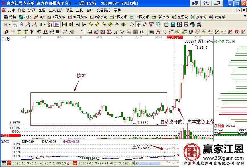 此后,股價(jià)經(jīng)過(guò)長(zhǎng)期的橫盤(pán)走勢(shì),在2000年3月14日開(kāi)始突破盤(pán)整走勢(shì),向上拉升,成本重心逐漸上移,macd指標(biāo)金叉信號(hào),同時(shí)量能也是倍量放大,是強(qiáng)勢(shì)股的走勢(shì),投資者可以積極的進(jìn)行布局操作。