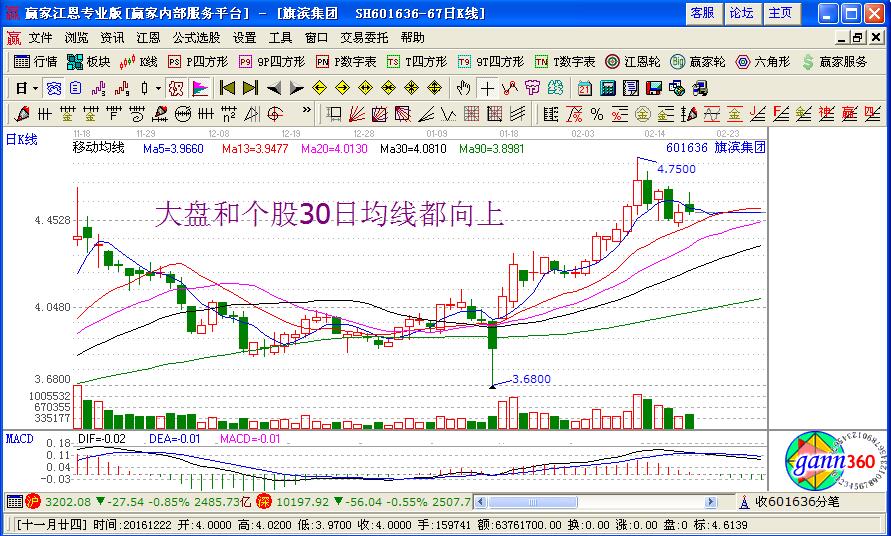 3.若大盤30日均線向上,個(gè)股30日均線也向上,此時(shí)出現(xiàn)的早晨十字星或者早晨之星k線組合,建議激進(jìn)型投資者可積極買進(jìn),穩(wěn)健型投資者可分批買進(jìn)。