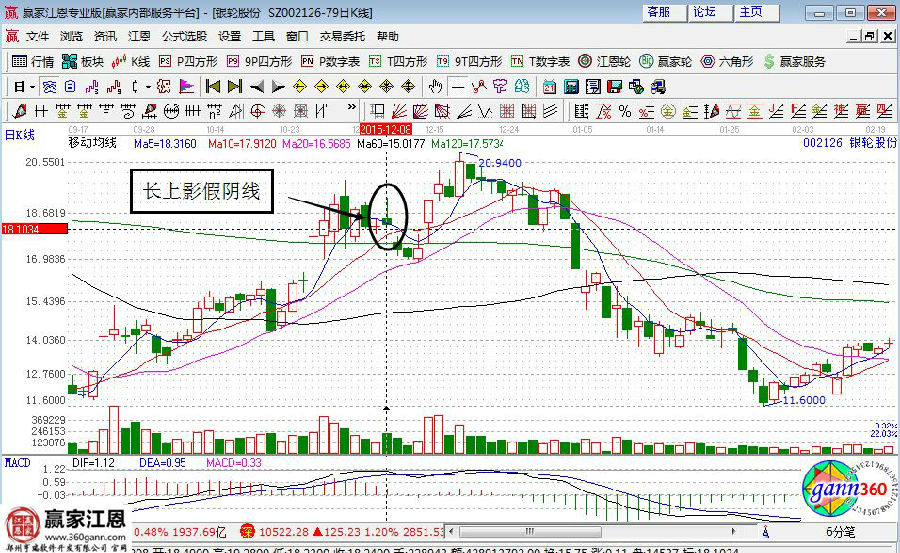 在2015年12月8日的時候,該股走出了一根長上影的假陰線(如下圖),當時自己看到這種走勢就會以為是拉高趕人的走勢,就會非常感興趣,第二天很想短線介入,但是通過研判之前的銀輪長上影所以選擇放棄,因為前面每次伴隨著長上影的總是下跌。