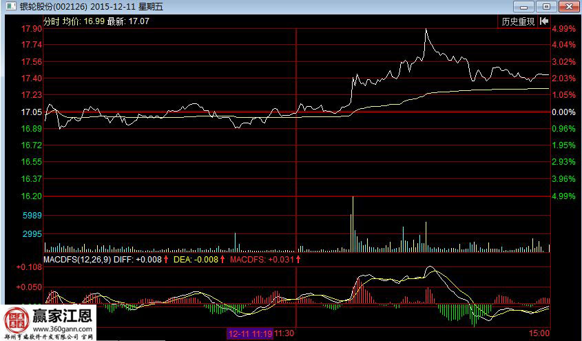在跳空低開以后的第二天,12.10全天橫盤針對那個收陰線,估計這個時候有大部分的分析者會認為是進入到了陰跌通道了,所以離場情緒是非常濃厚的,而這之后的走勢就會更加的有趣了。下面是2015年12月11日的分時走勢圖。