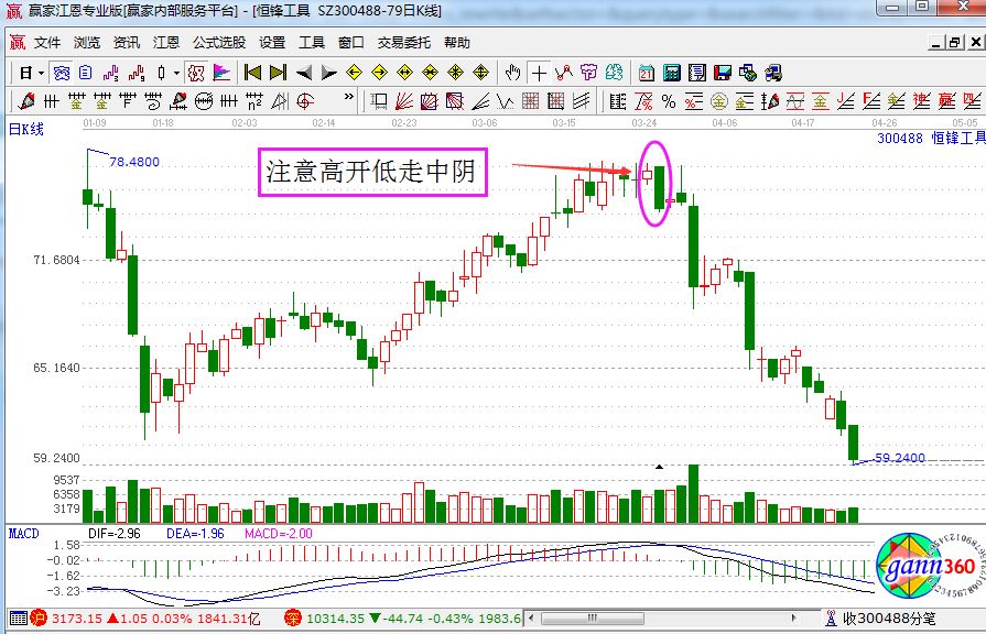 當(dāng)個(gè)股在一定的拉升之后,出現(xiàn)高開低走,收中陰線的時(shí)候,說明市場(chǎng)繼續(xù)拉升的意愿不強(qiáng),很可能是中線持倉(cāng)者在大量的拋售,后面很可能繼續(xù)回調(diào),所以要及時(shí)的出局,防止被套。