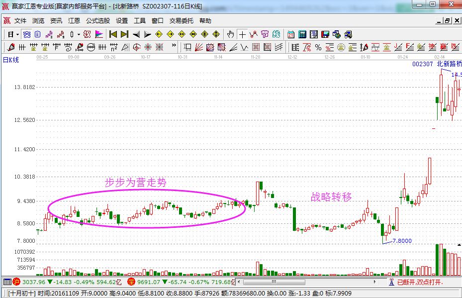 擺動(dòng)交易的底部至頂部的上行段為“步步為營(yíng)”階段,該階段的日K線(xiàn)組合特點(diǎn)為上漲有量,下跌縮量,股價(jià)穩(wěn)步上行。如下面就是運(yùn)用炒股軟件所截取的北新路橋走勢(shì)圖。