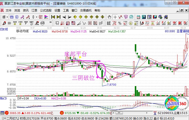 底部三陰破位就是:股價前期構(gòu)筑底部平臺,股價擊穿前期底部平臺,股價受20日、60日均線壓制,5、10、20、60日均線空頭排列,5日均線下穿10日均線形成死叉。如下面運用炒股軟件所截取的亞星錨鏈走勢圖。