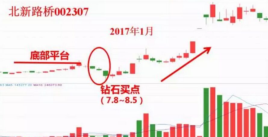 圖中的亞星錨鏈在8元附近出現(xiàn)底部三陰破位的模型,跌破主力的成本區(qū)間,形成中期的鉆石買點。當(dāng)前期軍工概念炒作時,它的表現(xiàn)異常突出,其中不乏主力資金參與其中的原因,也正因為此,圖中提示的買點,成為階段性的絕對低價。接下來我們看北新路橋走勢圖。