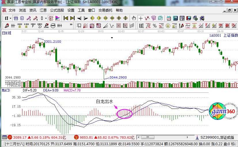 白龍出水是什么意思?所謂的白龍其實(shí)指的就是macd指標(biāo)中的DIF線(xiàn),0軸為海平面,由于股價(jià)長(zhǎng)期低迷致使DIF猶如一條沉睡的巨龍潛伏于海底,當(dāng)某日受到外力作用緩緩上移至水面時(shí)突然一躍而起,似一條白龍直沖云宵,勢(shì)頭強(qiáng)勁股價(jià)被迅速推高,因此稱(chēng)之為“白龍出水”。此形態(tài)是非常難得的短線(xiàn)買(mǎi)入時(shí)機(jī)。如下面運(yùn)用炒股軟件中所截取的上證走勢(shì)走勢(shì)圖。
