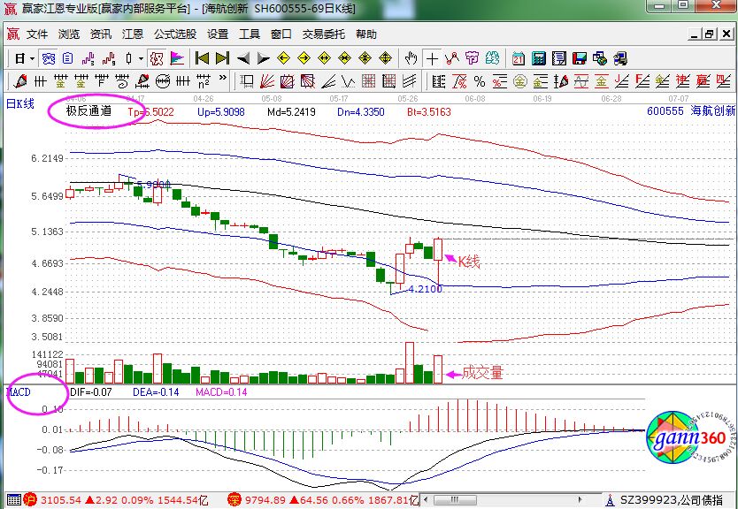 當(dāng)我們調(diào)到K線的時(shí)候,一般會(huì)在K線的下方對(duì)應(yīng)成交量的量柱,在成交量的下方像macd、kdj指標(biāo)等的出現(xiàn),當(dāng)然這是要根據(jù)投資者自己的使用愛(ài)好進(jìn)行調(diào)整的,在K線的上,大家也可以調(diào)出boll指標(biāo)、極反通道、均線等指標(biāo)的應(yīng)用。下面就是贏家江恩軟件中海航創(chuàng)新的走勢(shì)圖。