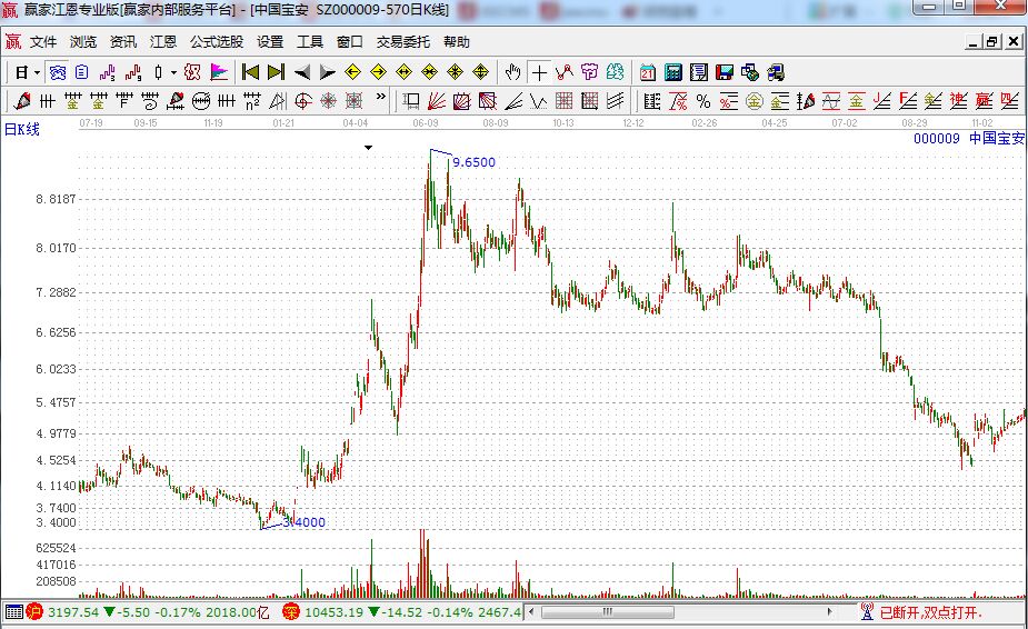 主力坐莊的完整過(guò)程通常是“吸、拉、派、落”,但受傷莊股的運(yùn)動(dòng)軌跡只有“吸、拉、落”,而少了一個(gè)“派”,就是說(shuō)主力經(jīng)過(guò)了吸籌和拉抬,沒(méi)來(lái)得及派發(fā)股價(jià)就回落了,這種情形令主力相當(dāng)難過(guò)——這就是受傷莊股。接下來(lái)我們就來(lái)看一只受傷莊股。