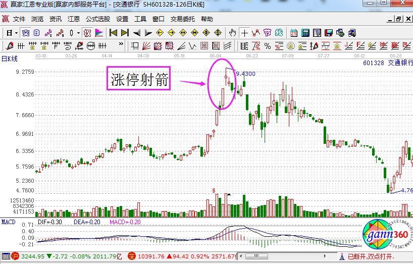 漲停射箭是什么?它指的就是高位漲停之后,莊家進行出貨手法。具體的介紹就是,股價在經(jīng)過一段時間的上升,創(chuàng)出階段新高,拉出漲停板之后,第二天的走勢是沖高回落,而且連帶著收出的是帶長上影線的小陽線或者是小陰線,同時成交量是大幅的放大,如下面的交通銀行走勢圖。
