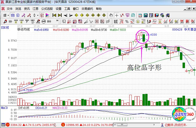 高位品字形是什么?它其實(shí)與黃昏之星形成的機(jī)理和內(nèi)涵基本上一只,但是不同的是第二根K線不要裘缺口、十字星、星形線這種極度收斂的形態(tài),一般來說小陽線、小陰線的出現(xiàn)次數(shù)最多,偶爾有中大養(yǎng)心啊或者陰線,這種形態(tài)的第二根K線判斷頭部的意義并不明顯,一般都要等到第三根中大陰線的時(shí)候才能判別頭部基本上形成,如下圖所示。