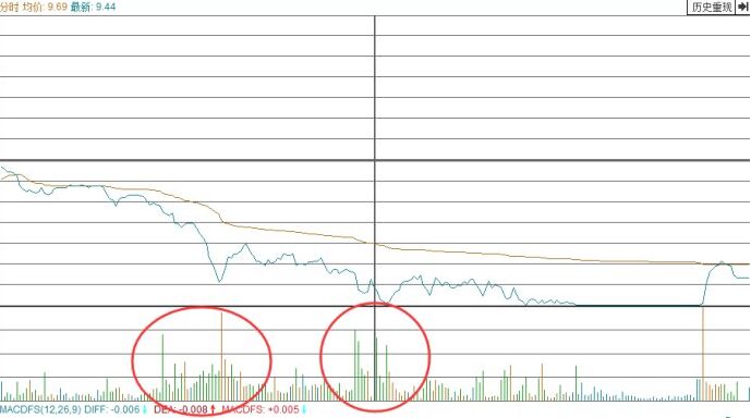 高位品字形的第三根K線形成當(dāng)天,早盤低開后股價(jià)是一路的放量下跌,形成了典型的量價(jià)背離。如下圖所示,在下面分時(shí)圖中的每一個(gè)低點(diǎn)都出現(xiàn)了放量。反彈也是縮量淺拉一下之后就繼續(xù)下跌,顯然此時(shí)主力出貨是非常堅(jiān)決的,其實(shí)在當(dāng)日來說也沒有特別理想的賣點(diǎn),只能在股價(jià)略有反彈的每一次的小高點(diǎn)賣出比較好了。