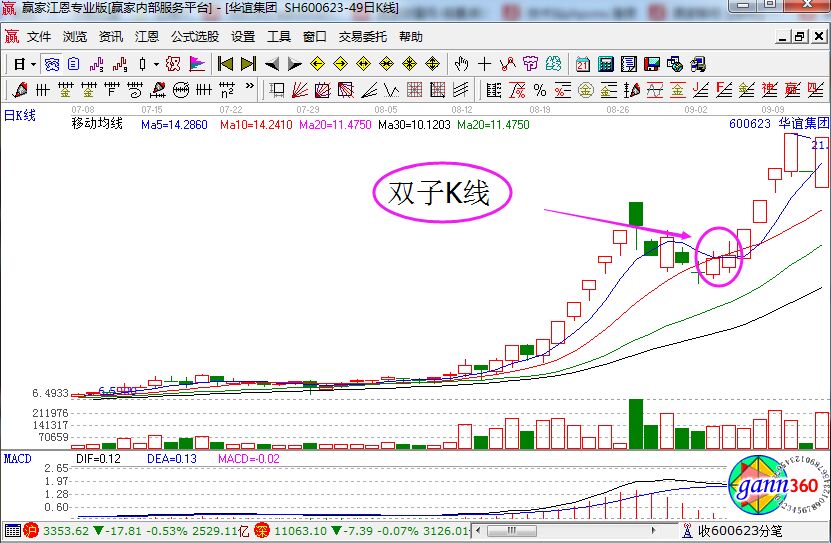雙子K線形態(tài)是什么樣的?首先它是由兩根K線所組成的,而且這兩個K線均為中小陽線,經(jīng)常出現(xiàn)的位置是在股價的低價位,這樣捕捉到的個股漲停的概率就會非常的大。該形態(tài)究竟是怎么樣的?大家可以參看下面華誼集團(tuán)的走勢來進(jìn)行記憶。