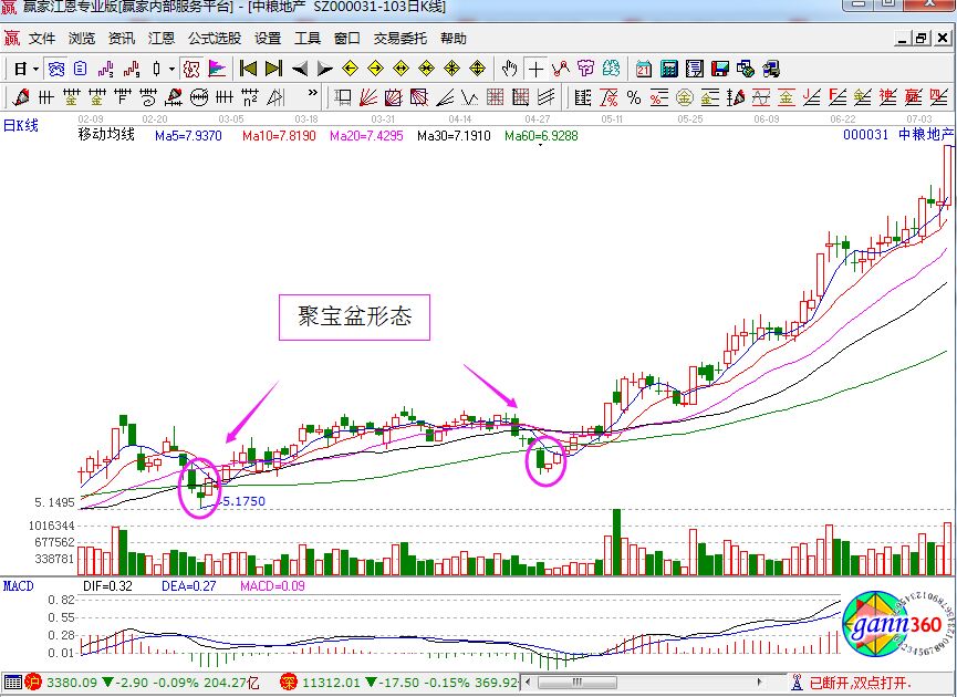 上圖是中糧地產(chǎn)的部分歷史走勢(shì)圖,從圖中我們看到,60日均線(綠色)的趨勢(shì)是向上的,而且K線已經(jīng)成交量都非常的滿足上面的技術(shù)特征,所以是典型的聚寶盆形態(tài)。