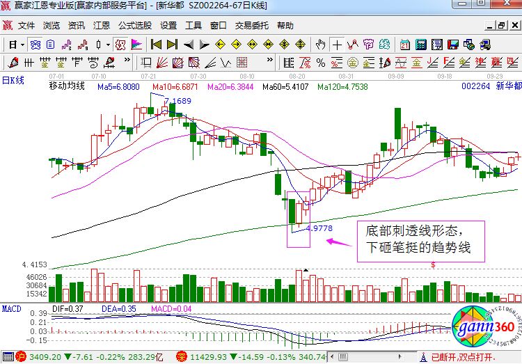 新華都走勢中,該股在底部的時候就形成了非常的明顯的刺透線形態(tài),而且是在大幅下挫之后,所以就可以判斷底部的成立了,具體的原因如下: