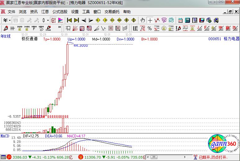 如上圖是該股的年線圖,從2005年開始到2016年,近11年的時間,格力電器每年的凈利潤,都是呈現(xiàn)處比較穩(wěn)定的正增長。表現(xiàn)在股價的反應,就是股價逐年的增長,近端四件該股的走勢也進入到了高潮期。