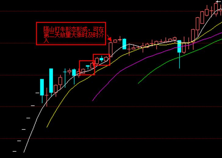 隔山打牛形態(tài)中的第一組3根K線出現(xiàn)的時候,應該保持對于股票走勢的高度關注,在第二組3根K線即將要形成的時候,可以在第二組的第三根陽線即將吞沒第二根陰線時介入,在隔山打牛形態(tài)形成之后,也是可以在次日盤中放量上攻的時候介入。