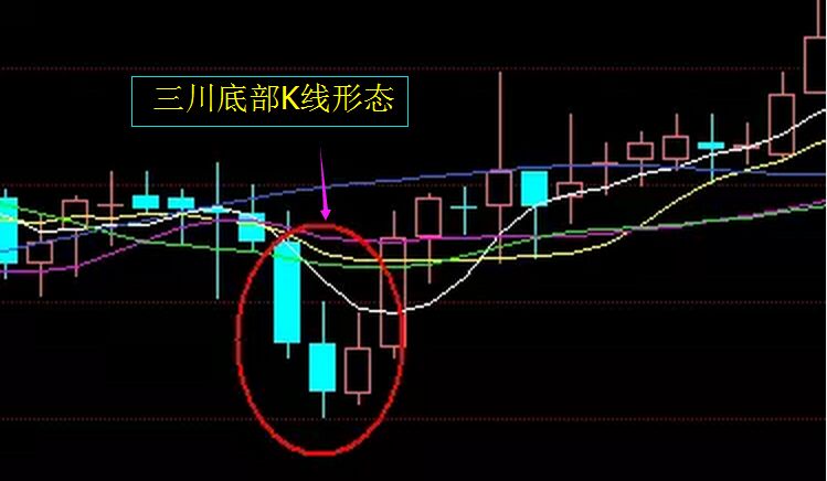 三川底部K線形態(tài)有什么樣的特征?首先,名字上看的話,該形態(tài)就是要處在低位,而且第一根K線應(yīng)是實(shí)體較長(zhǎng)且?guī)в休^長(zhǎng)下影的陰線;其次第二條K線是一條陰線,要求向上跳空開(kāi)盤,實(shí)體比較小,而且還要帶有較長(zhǎng)的下影線,并且最低價(jià)要低于前一陰線的最低價(jià)。最后第三條K線是一條孕育在前一根K線下影線中的小陽(yáng)線,最低價(jià)應(yīng)該比前兩條線的最低價(jià)要高出許多。如下圖所示。