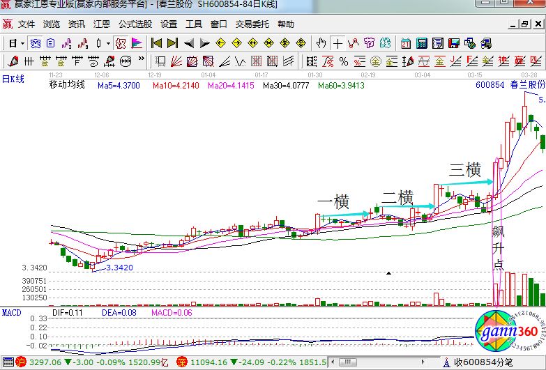 春蘭股份在2012年12月份的走勢中,我們可以看到,該股在27日站上了60日中期均線,它是屬于可以操作的范圍。該股在2013年1月30日出現(xiàn)了大陽線,在隨后小K線縮量盤整,盤后繼續(xù)出現(xiàn)了二橫三橫,在三橫經(jīng)歷了8根K線后爆發(fā),走出了幾十點的行情,這里需要注意的是: