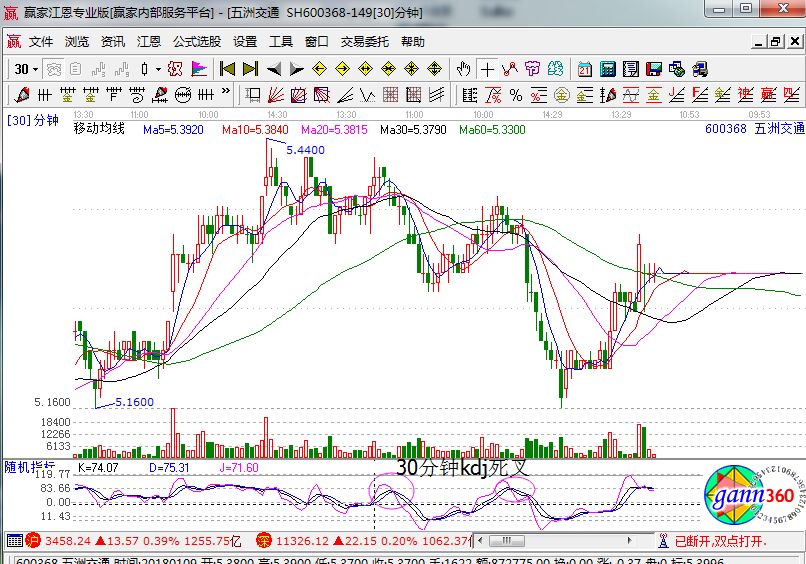 ④從技術(shù)面上分析的話,當(dāng)天不能漲停,或者30分鐘和60分鐘的kdj在高位形成死叉(如下面的五洲交通走勢(shì)圖),投資者都應(yīng)該進(jìn)行清倉出局了。