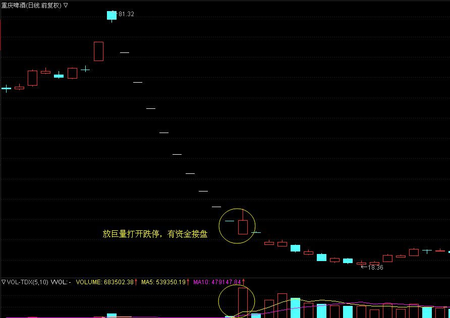 對于一字跌停板來說,全天成交量越小,換手率月底,就說明了空方的拋壓越多,多方的承接盤也就越少了,所以相應(yīng)的后續(xù)下跌的力量就會更強(qiáng),跌幅更大。相反的,如果成交量越大,換手率就越高,那就說明了多方承接盤開始大量介入,相應(yīng)的股價(jià)就會立即止跌企穩(wěn)。如下面的重慶啤酒走勢圖。