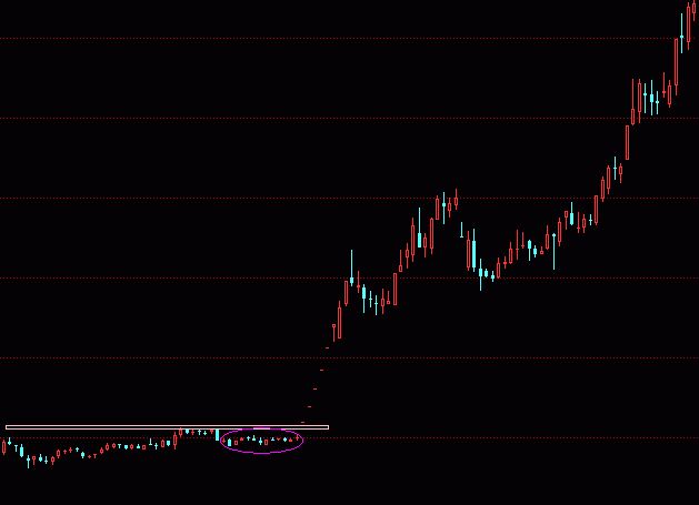像上面的這種圖形,大家可以看到該股在前面的時候是處于大箱體的震蕩之中的,股價在漲停突破箱體的壓力線的之后,股價就出現(xiàn)了一路上漲的走勢,顯然是非常強勢的,而且后面的漲幅也是非常驚人的。