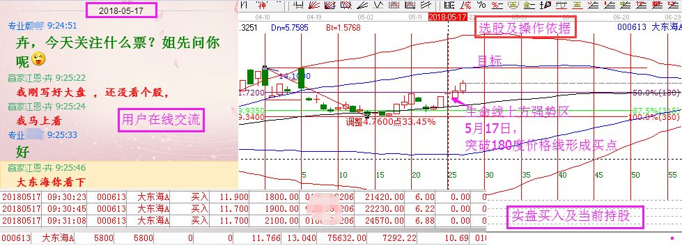 在5月17日依據(jù)贏家江恩的市價(jià)法則選擇,時(shí)間點(diǎn)突破江恩180度壓力線,形成買點(diǎn)。用戶按照規(guī)則同步操作,持股3個交易日,短線獲利已達(dá)10%。短期目標(biāo)上方藍(lán)線,不能放量突破短線兌現(xiàn)換股,如下圖所示。