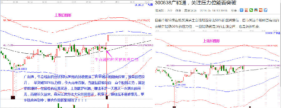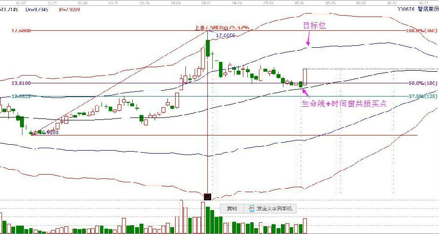 生命線和百分比50%區(qū)間內(nèi)持續(xù)震蕩,直至到達(dá)時(shí)間窗位置,放量漲停拉升,依據(jù)突破50%壓力位,連續(xù)兩個漲停板。當(dāng)能提前看明白一只股票的走勢,就能提前埋伏,在最佳的位置買進(jìn),上漲就是利潤。如下圖所示。