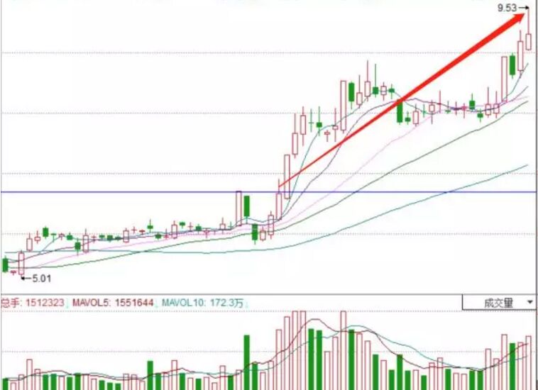 上圖是寶泰隆在2016年8月份的時(shí)候,當(dāng)時(shí)上升指數(shù)是小幅度盤跌之后見底上漲,而該股卻能夠先于大盤創(chuàng)出當(dāng)時(shí)的新高,一下子突破了所有均線的壓制,顯然是典型的魚躍龍門形態(tài),同時(shí)在形成該形態(tài)的同時(shí)放出巨量,市場資金加速流入,隨后的30個(gè)交易日內(nèi),股價(jià)卻從未跌破30日均線,累計(jì)上漲達(dá)到了40%。