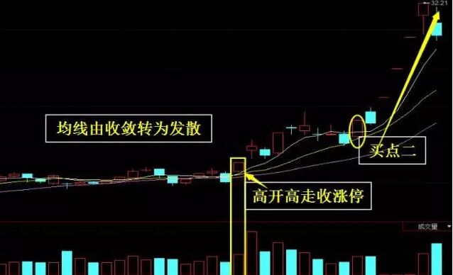 出現(xiàn)在中長期上升趨勢的初期,或長期上升趨勢大的中期調(diào)整行情末期。5日、10日和20日均線由逐漸收斂、粘合轉(zhuǎn)為緩慢發(fā)散。日K線上以小陽線、小陰線穩(wěn)步緩慢攀升,其中小陽線居多。股價(jià)或指數(shù)跳空高開,放量收出大陽線或中陽線,越過所有周期均線,并突破其他技術(shù)形態(tài)上的關(guān)鍵位置。