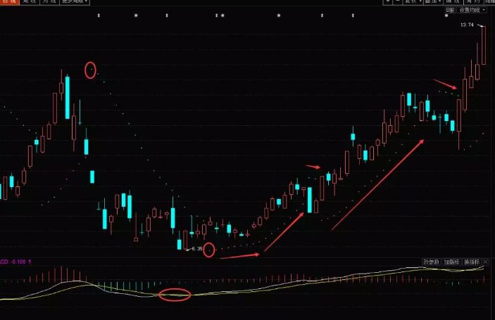 股票SAR指標(biāo)是怎么組成的?SAR指標(biāo)的另外一個(gè)別稱就是拋物線指標(biāo),因?yàn)榕c拋物線詭計(jì)相似,所以有紅虛線和綠虛線之分。當(dāng)股價(jià)跌破拋物線的時(shí)候,就說(shuō)明了空方力量強(qiáng)勢(shì),所以是綠色。當(dāng)K線突破拋物線的時(shí)候,則說(shuō)明了多方力量強(qiáng)勢(shì),所以是紅色,一般紅色就是買入,;綠色就是賣出。