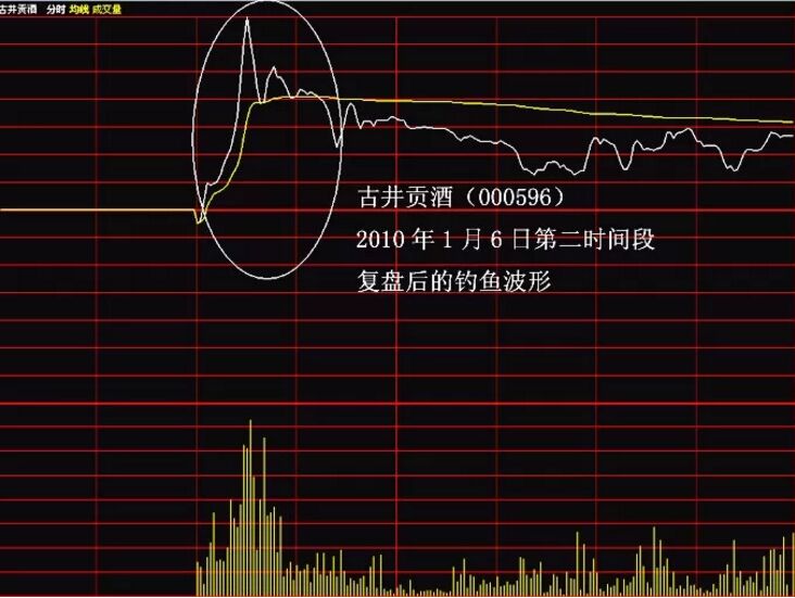 股票釣魚波是怎么樣的?它其實(shí)指的就是股價在盤中拉升過程中弧線幾乎垂直式跳水下跌的波動特征,因這一波動特征而形成的即時波形就是“釣魚波”。由于該形態(tài)出現(xiàn)前,股價呈現(xiàn)長波攻擊性拉高特征,當(dāng)股價漲至一定高位時,盤中突然跳水,其形態(tài)就像釣魚姿態(tài),故此得名。如下面的古井貢酒的分時走勢圖。