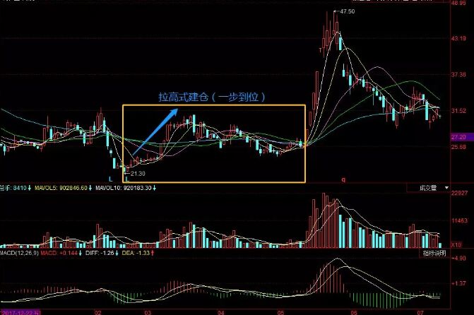 拉高式建倉大多是出現(xiàn)在冷門股以及長期下跌的股票中,具體的表現(xiàn)就是:股價迅速從低位抬高,成交量急速放大。這種以空間換取時間的建倉方式表明莊家實力雄厚、作風(fēng)兇悍,后期必有巨大的上升空間。拉高式建倉一般有兩種情況,即一步到位式和連續(xù)拉升式。