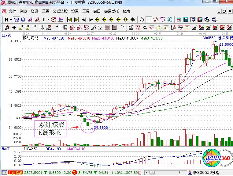 在股市,可謂大魚吃小魚,小魚吃蝦米了。之后該股緩慢的再次爬出上升通道,這樣的“雙針探底”,強(qiáng)悍洗盤,正從另一個(gè)側(cè)面暗示了該股日后將大牛!該股從這個(gè)“雙針探底”之后,走出了單邊上漲!