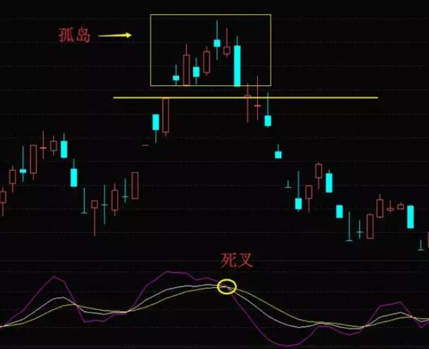 除此之外,我們參考一下幅圖指標(biāo)KDJ,島型形態(tài)形態(tài)之后,該指標(biāo)顯示股價(jià)處于超買狀態(tài),拐頭向下,形成死叉,則更可確認(rèn)后市下跌的走勢(shì)。