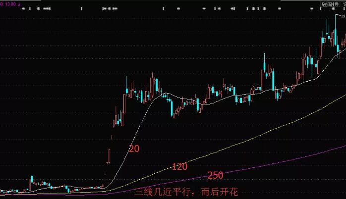 在圖1中,股價(jià)在相對(duì)的低位,20日均線上穿120、250日均線,顯示了多頭的起步,之后隨著K線上漲,120日均線拐頭向上而且突破250日均線,再度形成金叉,三均線就形成了3個(gè)金叉,這樣就形成了價(jià)托,對(duì)于K線是有效的支撐,這三條均線呈現(xiàn)多頭排列,向上發(fā)散,顯示上升趨勢開啟,后期牛市來臨,投資者就可以適當(dāng)?shù)馁I入。所以在上圖中就是一個(gè)典型的均線三線開花形態(tài)。接下來我們來看沒有金叉的三線開花形態(tài)圖形。