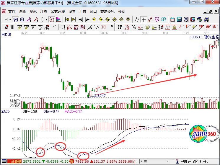 海底撈月的走勢(shì)與上面的空中纜車形態(tài)是非常相似的,位置不同,只不過海底撈月的走勢(shì)是出現(xiàn)在零軸線的下方。如下面的豫光金鉛走勢(shì)圖。