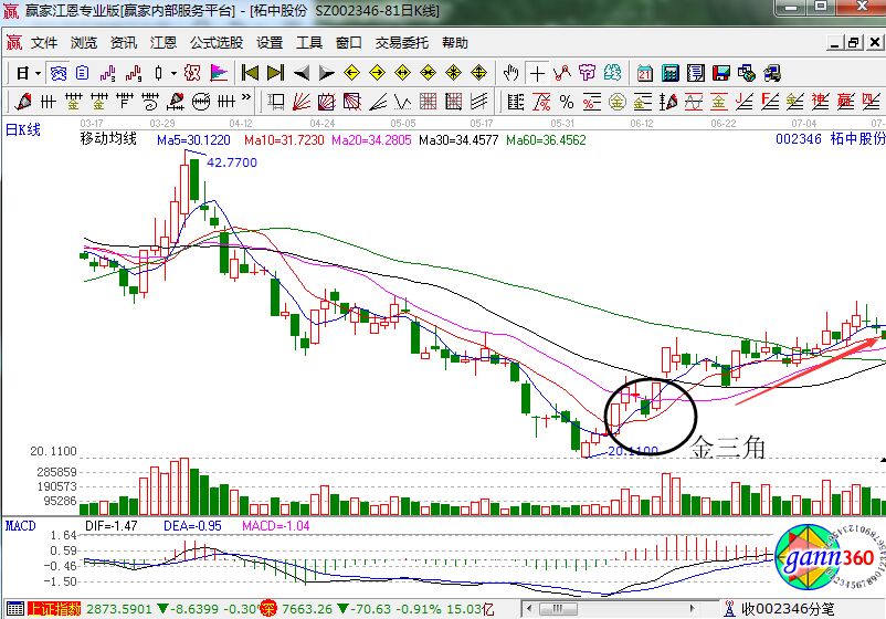 我們來看柘中股份的日K線走勢圖,從圖中我們可以看到該股的低位形成了一個金三角金叉,但是盈利空間來看,本段行情形成后的漲幅有30%多,不算太多,但是和當時其他股票來比較,利潤還是比較的客觀。如上圖所示,在一輪震蕩下跌后,行情開始低位出現(xiàn)幾根陽線,然后5日均線迅速的穿過10日和20日線,這個時候10日線也震蕩攀升穿過20日線。終于,行情在較低位置形成一個金三角。暗示后市行情將會有較大漲幅,此階段進場最佳。