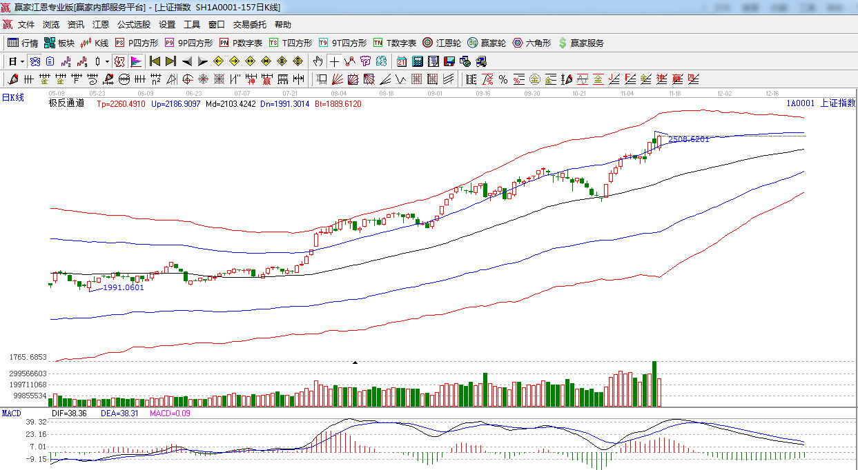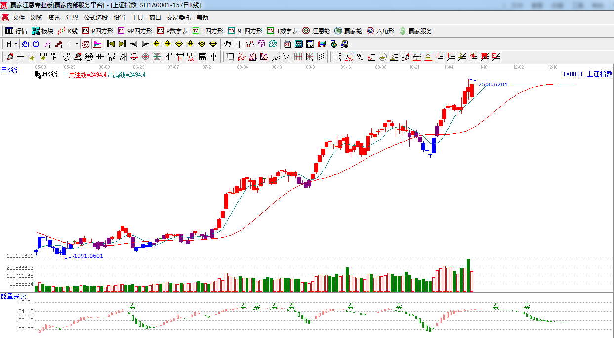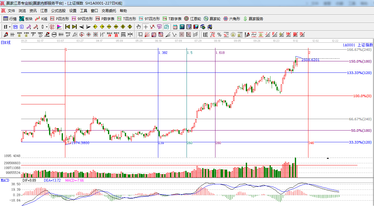 江恩看盤(pán)綜述:依據(jù)贏家江恩技術(shù)工具分析得出:上證指數(shù)低開(kāi)高走,以中陽(yáng)線報(bào)收,收復(fù)江恩180度2480點(diǎn),但量能較昨日大幅減少,后期若無(wú)量能跟隨,短期維持在2500點(diǎn)附近形成強(qiáng)勢(shì)震蕩行情難以避免,短線依然留意180度2480點(diǎn)的得失,本月重要時(shí)間窗口在11月24日。
