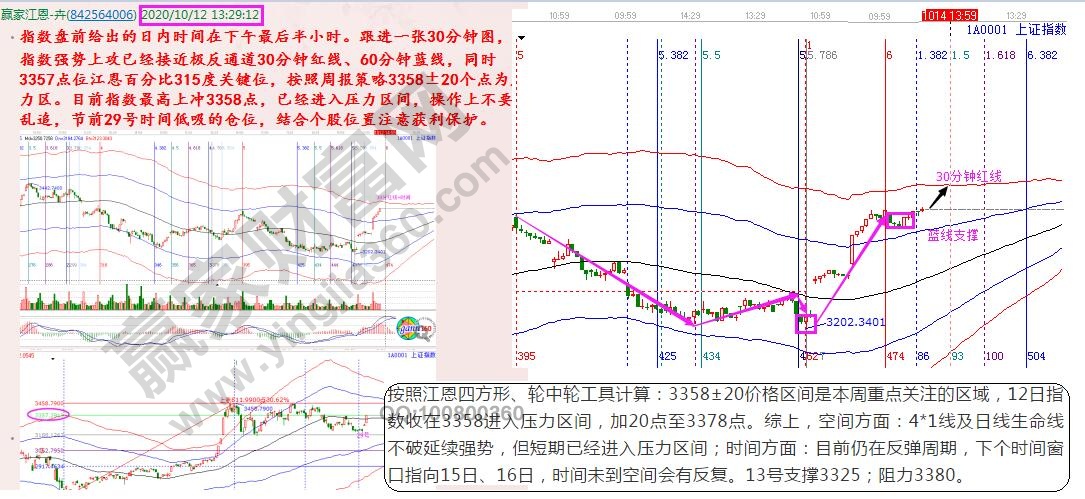對照當(dāng)下回顧歷史,在提前預(yù)測和實際走勢的對比中,學(xué)習(xí)感悟江恩時空技術(shù)的魅力。12日大盤分析,指數(shù)到達(dá)預(yù)期關(guān)鍵位3358點,進(jìn)入壓力區(qū)間。但,日線時間并未走完,空間還有反復(fù),不破3325點仍屬強(qiáng)勢,可繼續(xù)把握個股機(jī)會。實則,13日指數(shù)直接低開下探,回踩日線生命線3330一線后,止跌回升再次沖擊3358。全天呈震蕩態(tài)勢,符合預(yù)期分析,等待日線下個時間窗。