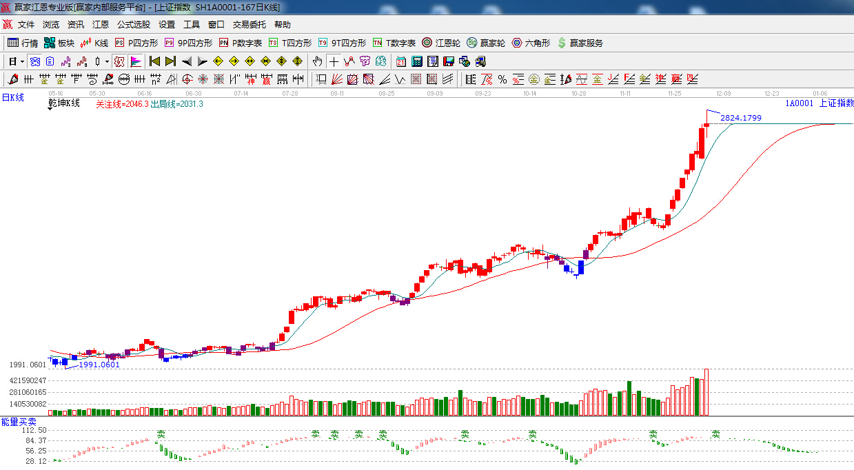 咨詢:13333833889周三兩市紛紛高開(kāi)高走,券商繼續(xù)維持強(qiáng)勢(shì),大盤(pán)一度沖擊江恩240度線附近,成交量明顯放大,午后權(quán)重集體跳水,題材股全面而上,終盤(pán)以放量十字星報(bào)收,盤(pán)面上,隨著券商板塊走勢(shì)的分化,有色板塊全面爆發(fā),多只個(gè)股漲停,另外,體育,軍工改制等有所表現(xiàn),創(chuàng)業(yè)板午后一改前期弱勢(shì)全線大漲,市場(chǎng)二八風(fēng)格進(jìn)一步加劇,權(quán)重和題材形成鮮明反差,今日市場(chǎng)之中的成交量可謂再度創(chuàng)出歷史新高,十字星報(bào)收,預(yù)計(jì)短期高位震蕩。下方支撐關(guān)注180度2743點(diǎn)。