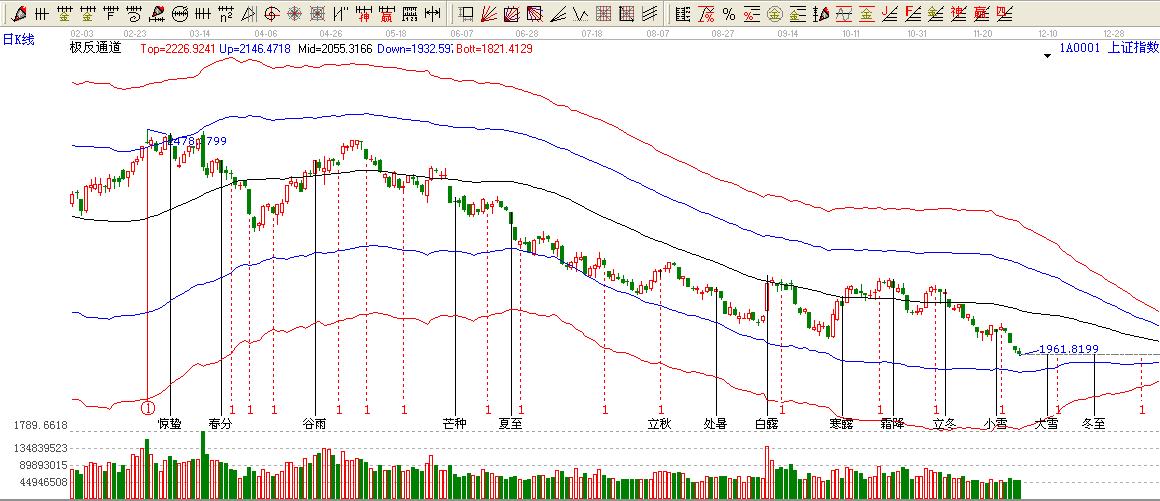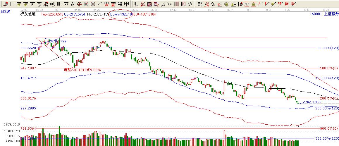 ☆依據(jù)贏家江恩系統(tǒng)極反通道提示:極反通道下軌位置1926點.極反通道隨著大盤下跌下移2個點。