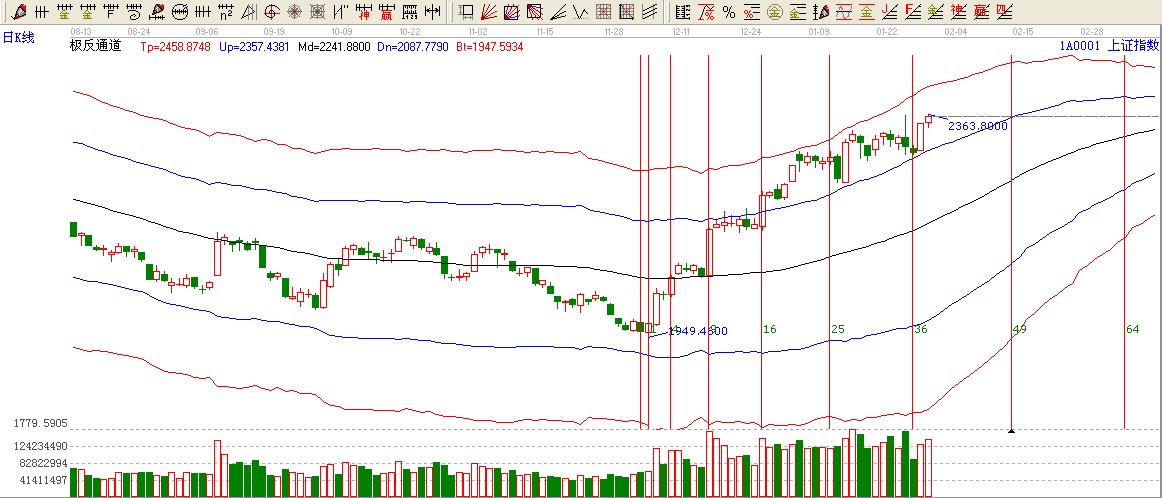 綜上所述:極反通道藍色上軌位置不破,按照極反通道應(yīng)用法則看高一線至2420附近。這里跟波段延伸線90度位置形成共振壓力。短期2330成為短期強支撐。