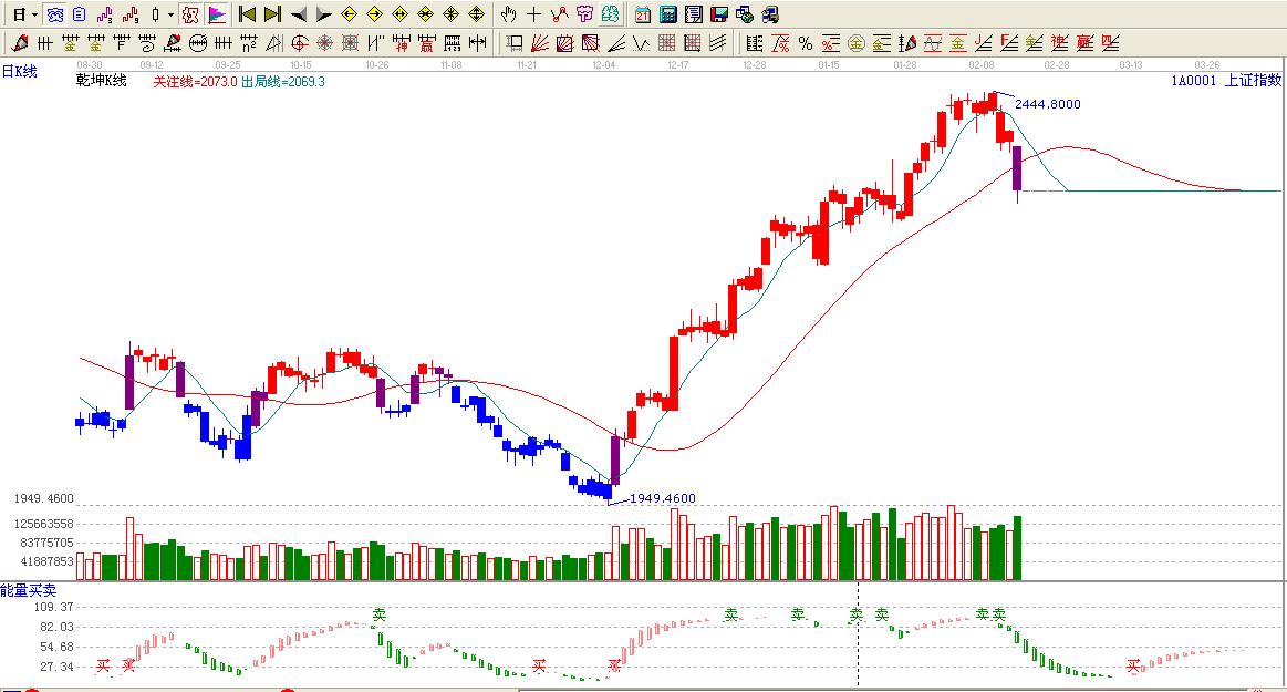 ☆依據(jù)贏家乾坤K線提示:大盤有紅色線轉(zhuǎn)換為紫色線,跌破關(guān)注線,看空。